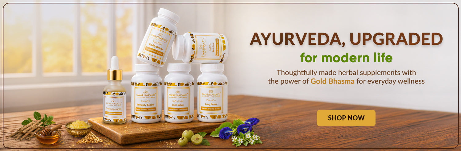 Swarnakayu brings Ayurveda and nature together in every capsule. Made with 100% natural herbs and Swarna Bhasma, our wellness products help modern lives reconnect with their roots and build strength for body, mind, and spirit.